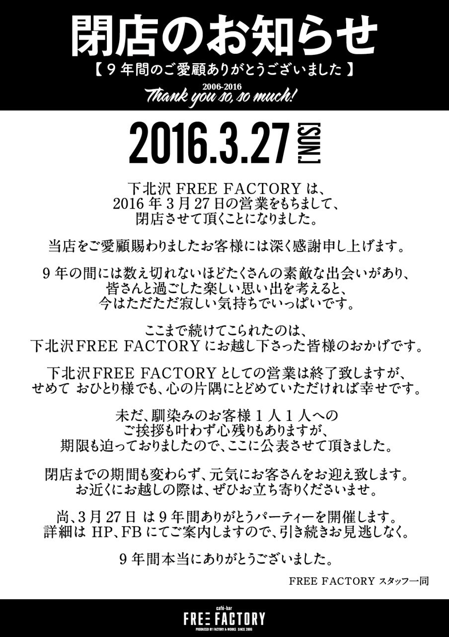 2016 年 3 月 27 日の営業をもちまして、閉店させて頂くことになりました。 9 年間ありがとうございました。 当店をご愛顧賜わりましたお客様には深く感謝申し上げます。 9 年の間には数え切れないほどたくさんの素敵な出会いがあり、 皆さんと過ごした楽しい思い出を考えると、今はただただ寂しい気持ちでいっぱいです。 ここまで続けてこられたのは、 下北沢FREE FACTORY にお越し下さった皆様のおかげです。 下北沢FREE FACTORY としての営業は終了致しますが、 せめておひとり様でも、心の片隅にとどめていただければ幸せです。 未だ、 馴染みのお客様 1人1人へのご挨拶も叶わず、心残りもありますが、 期限も迫っておりましたので、ここに公表させて頂きました。 閉店までの期間も変わらず、元気にお客様をお迎え致します。 お近くにお越しの際は、ぜひお立ち寄りくださいませ。 尚、 最終日の 3 月 27 日(日) は 『 9年間ありがとうパーティー 』 を開催する予定です。 詳細はHP、FBにてご案内いたしますので、引き続きお見逃しなく。 9年間ありがとうございました。 FREE FACTORY スタッフ一同